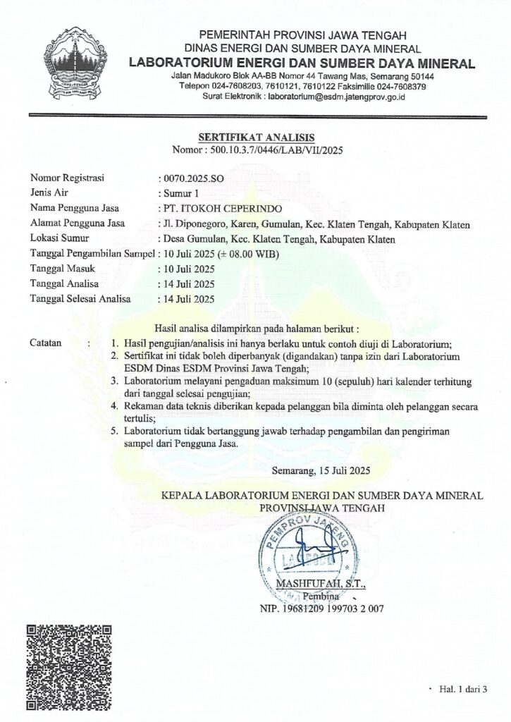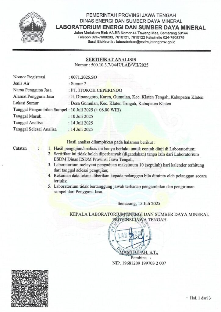 Pada bulan Juli 2025 PT. Itokoh Ceperindo melaksanakan Uji Kulaitas Air Sumur sesuai dengan Permenkes No. 2 tahun 2024 tentang peraturan pelaksanaan peraturan pemerintah nomor 66 tahun 2014. Uji kualitas air sumur di tempat kerja merupakan langkah yang sangat penting dalam menjaga kesehatan dan keselamatan karyawan serta kelangsungan operasional perusahaan secara keseluruhan. Air merupakan sumber daya vital yang digunakan dalam berbagai kegiatan karyawan , persiapan makanan, dan minuman, serta untuk keperluan sanitasi dan kebersihan. Kualitas air yang buruk dapat menyebabkan berbagai masalah kesehatan, seperti penyakit perut, infeksi kulit, dan bahkan keracunan, yang pada gilirannya dapat menyebabkan absensi kerja dan penurunan produktivitas. Selain itu, air yang terkontaminasi juga dapat merusak peralatan dan infrastruktur perusahaan, serta mengganggu kualitas produk akhir. Dengan melakukan uji kualitas air secara teratur, perusahaan dapat memastikan bahwa air yang digunakan memenuhi standar kebersihan dan keselamatan yang ditetapkan, melindungi karyawan dari risiko penyakit dan cedera, serta menjaga reputasi perusahaan di mata konsumen dan pihak berwenang. Oleh karena itu, uji kualitas air di tempat kerja tidak hanya merupakan kewajiban hukum, tetapi juga investasi yang sangat penting dalam menjaga kesejahteraan karyawan dan kesinambungan operasional perusahaan.